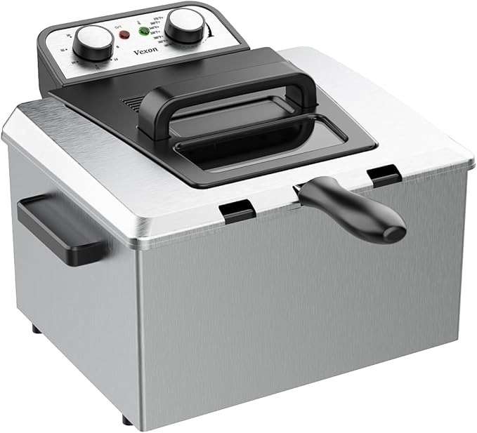 The Presto 05411 GranPappy Electric Deep Fryer offers a 6-cup oil capacity with 1500 watts of power, featuring a fixed 375°F temperature and non-stick interior for easy cleaning, all in a compact 9.1 x 8.8 x 8.5-inch, 4.2-pound design. The Vexon 1800W 5 Liters/21 Cups Large Electric Deep Fryer boasts a 5-liter capacity, adjustable thermostat…